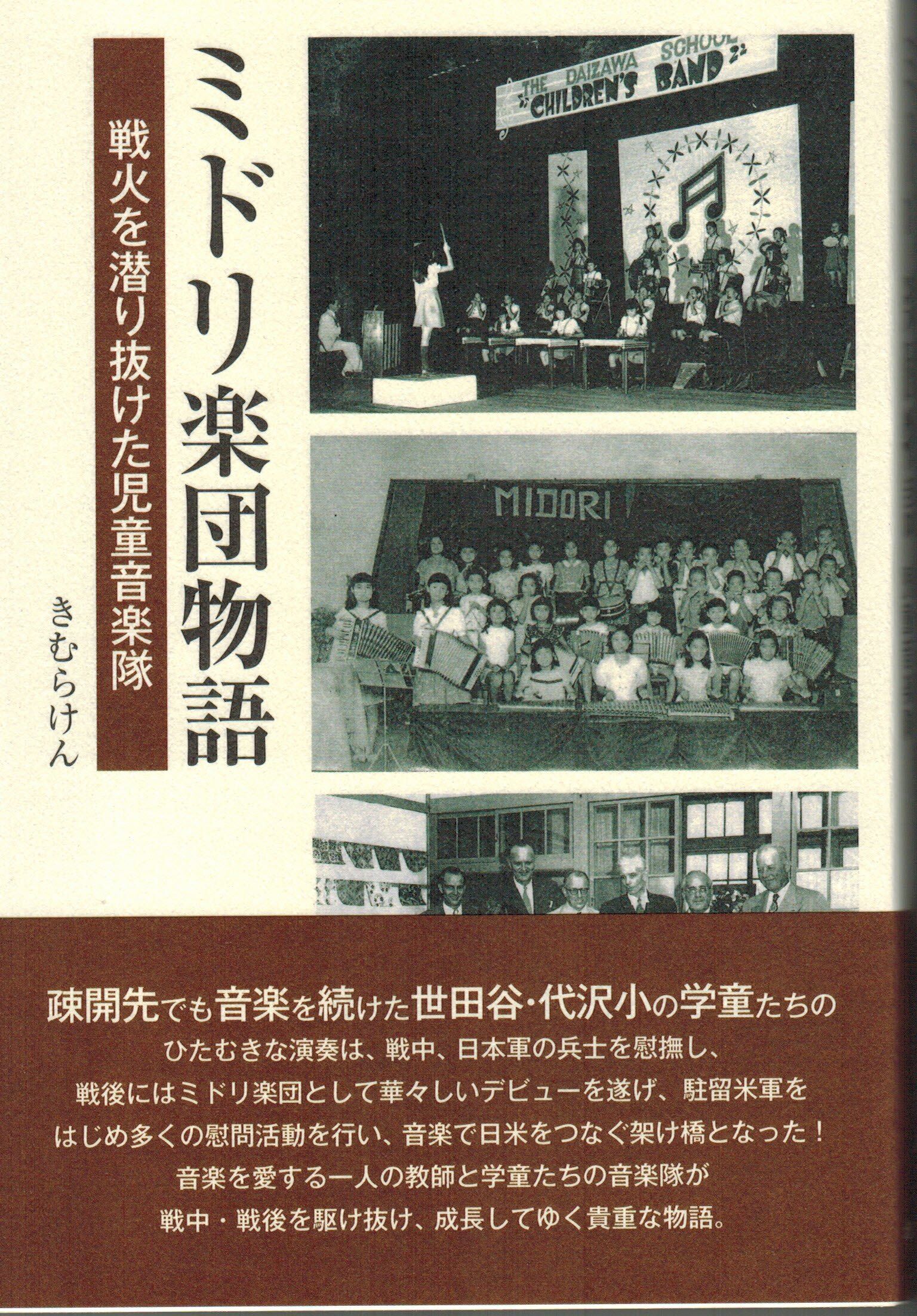 同封した「ミドリ楽団物語」です。この楽団は、戦後、東京世田谷区代沢小学校に結成された児童楽団です。指導者は浜館菊雄という音楽の先生です。この楽団、知られていないことですが戦後、日本に進駐してきた米軍への慰問活動を繰り返してきました。米軍キャンプであるとか、宿泊ホテルだとか、米軍が接収した劇場とかで慰問演奏活動を行ってきました。