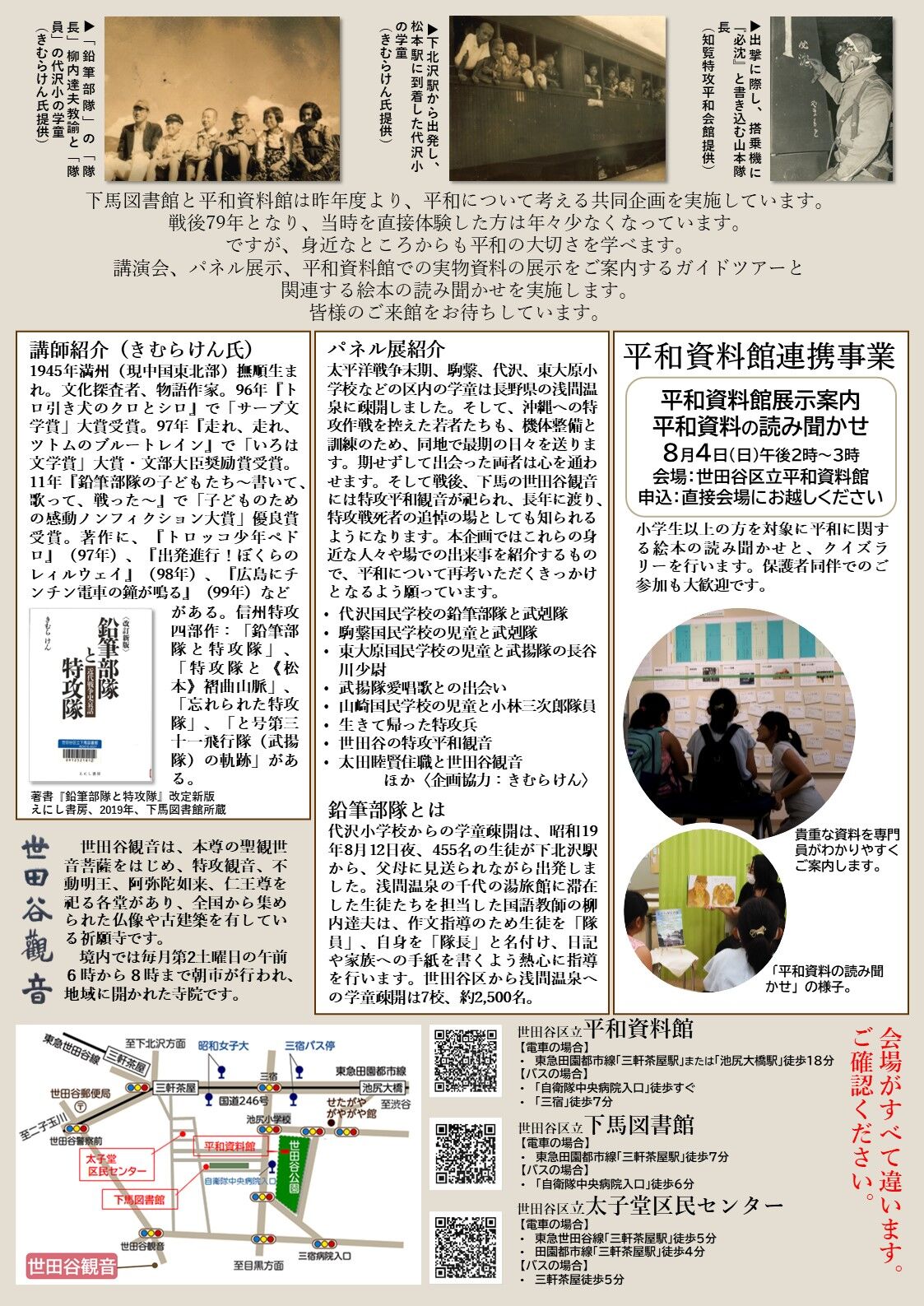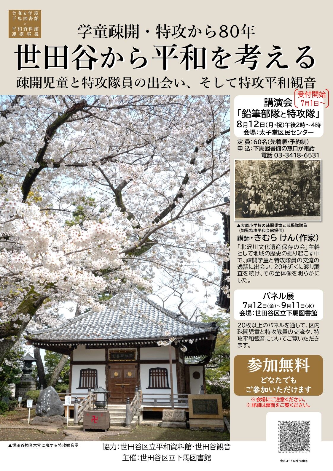 ¡¡ÂåÂô¹ṉ̃³Ø¹»¤ÎÁ³«½Ðȯ¤Ï1944ǯ8·î12Æü¤À¤Ã¤¿¡£¤³¤ÎÆü¤Ë¤Ö¤Ä¤±¤Æ¤Î¹Ö±é²ñ³«ºÅ¤À¡£¤Á¤ç¤¦¤É£¸£°Ç¯Á°¤È¤Ê¤ë¡£´ë²è¤Ï¡ÖÀ¤ÅÄ뤫¤éʿϤò¹Í¤¨¤ë¡ÝÁ³«³«»Ï¡¦ÆÃ¹¶¤«¤é£¸£°Ç¯¡Ý¡×¤Ç¤¢¤ë¡£¤È¤Ï¤¤¤Ã¤Æ¤âÅö»ö¼Ô¤Ï¤³¤ì¤Ë£±£°ºÐ¤ò²Ã¤¨¤ë¡¢Åö»þ»ÍǯÀ¸¤À¤Ã¤¿¿Í¤Ï£¹£°ºÐ¤Ç¤¢¤ë¡£