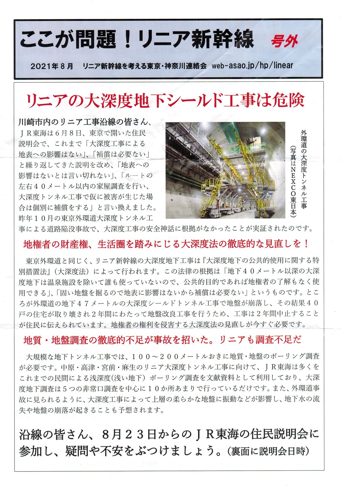 ¡¡Åìµþ³°´ÄÆ»¤ÈƱ¤¸¤¯¡¢¥ê¥Ë¥¢¿·´´Àþ¤ÎÂ翼ÅÙÃϲ¼¹©»ö¤Ï¡ØÂ翼ÅÙÃϲ¼¤Î¸ø¶¦Åª»ÈÍѤ˴ؤ¹¤ëÆÃÊÌÁ¼ÃÖË¡¡Ù¡ÊÂ翼ÅÙË¡¡Ë¤Ë¤è¤Ã¤Æ¹Ô¤ï¤ì¤Þ¤¹¡£¤³¤ÎˡΧ¤Îº¬µò¤Ï¡ÖÃϲ¼£´£°¥á¡¼¥È¥ë°Ê¿¼Â翼ÅÙÃϲ¼¤Ï²¹Àô»ÜÀߤò½ü¤¤¤ÆÃ¯¤â»È¤Ã¤Æ¤¤¤Ê¤¤¤Î¤Ç¡¢¸ø¶¦ÌÜŪ¤Ç¤¢¤ì¤ÐÃϸ¢¼Ô¤Îλ²ò¤â¤Ê¤¯»ÈÍѤǤ¤ë¡×¡¢¡Ö¹Å¤¤ÃÏÈפò·¡¤ë¤Î¤ÇÃÏɽ¤Ë±Æ¶Á¤Ï¤Ê¤¤¤«¤éÊä½þ¤ÏɬÍפʤ¤¡×¤È¤¤¤¦¤â¤Î¤Ç¤¹¡£¤È¤³¤í¤¬³°´ÄÆ»¤ÎÃϲ¼£´£·¥á¡¼¥È¥ëÂ翼ÅÙ¥·¡¼¥ë¥É¹©»ö¤ÇÃÏÈפ¬ÊøÍ¡¢¤½¤Î·ë²Ì£´£°¸Í¤Î½»Â𤬼è¤ê²õ¤µ¤ì£²Ç¯´Ö¤Ë¤ï¤¿¤Ã¤ÆÃÏÈײþÎɹ©»ö¤ò¹Ô¤¦¤¿¤á¡¢¹©»ö¤Ï£²Ç¯´ÖÃæ»ß¤¹¤ë¤³¤È¤¬½»Ì±¤ËÅÁ¤¨¤é¤ì¤Æ¤¤¤Þ¤¹¡£Ãϸ¢¼Ô¤Î¸¢Íø¤ò¿¯³²¤¹¤ëÂ翼ÅÙË¡¤Î¸«Ä¾¤·¤¬º£¤¹¤°É¬ÍפǤ¹¡£